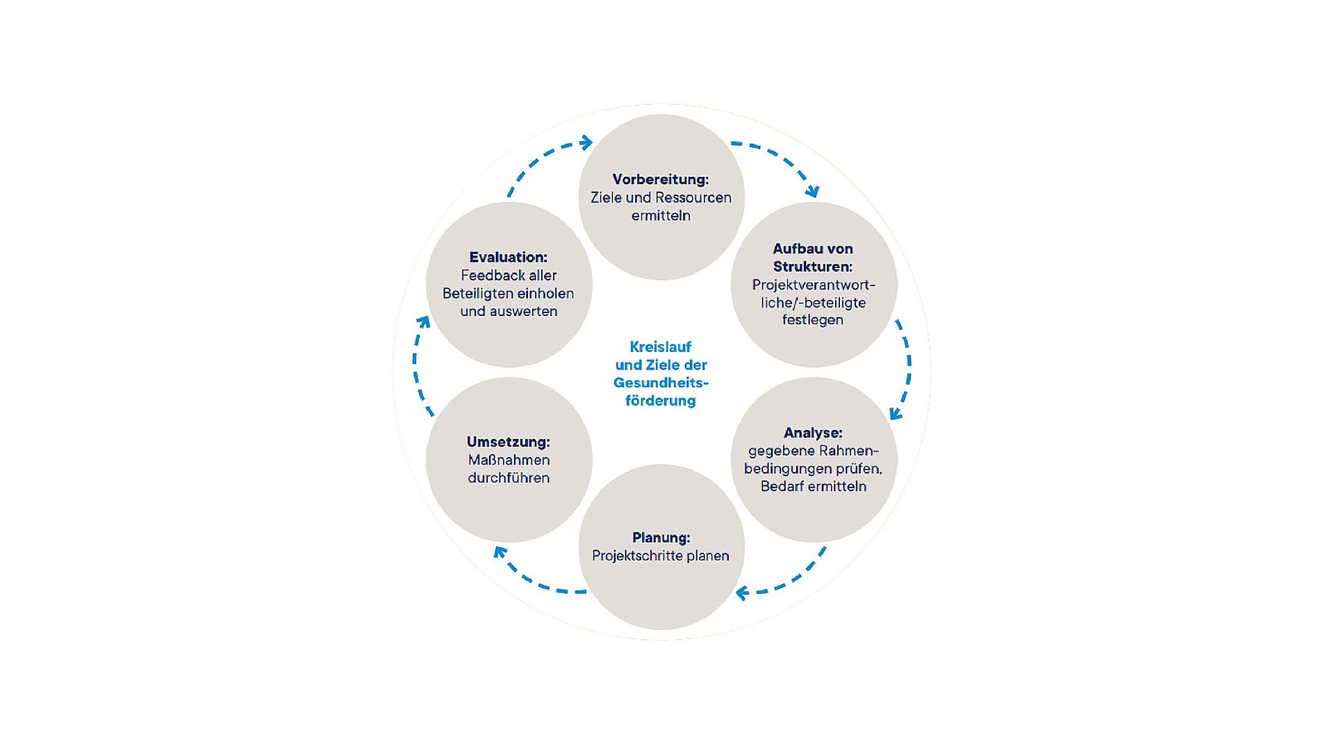 In der Evaluationsphase werden die umgesetzten Maßnahmen gründlich auf den Prüfstand gestellt. Entscheidend ist dabei eine offene aber konstruktive Feedback-Kultur, die es ermöglicht, aus den Erfahrungen aller Beteiligten zu lernen. Ziel der Evaluationsphase ist es, aus den Ergebnissen Anhaltspunkte für weiteren Handlungsbedarf zu ermitteln und die nachhaltige Verankerung von Gesundheit im Setting zu etablieren.